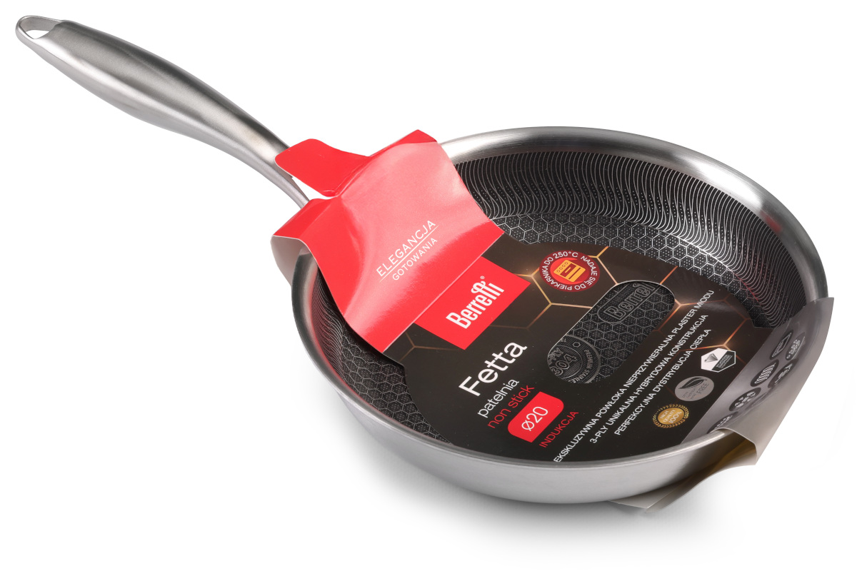 Patelnia BERRETTI FETTA Ø 20 cm z linii FETTA to wysokiej jakości patelnia z 3‑warstwową konstrukcją (stal nierdzewna 304 + aluminium + stal nierdzewna 430), wyposażona w trwałą wielowarstwową powłokę nieprzywierającą PLASTER MODU. Głębokie dno z fakturą heksagonalną zapewnia doskonałe rozprowadzanie ciepła, równomierne smażenie i minimalne przywieranie potraw. Patelnia jest w pełni indukcyjna, kompatybilna ze wszystkimi typami kuchenek i odporna na piekarnik (do wysokich temperatur).